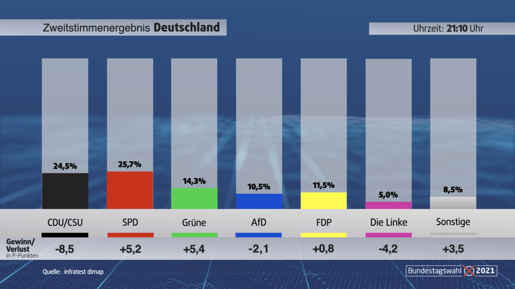 Die CDUCSU fällt auf 241 bis 245 Prozent 329. Sowohl Olaf Scholz als auch Armin Laschet wollen eine Regierung bilden. So werden die Zahlen bis 1930 Uhr immer genauer.